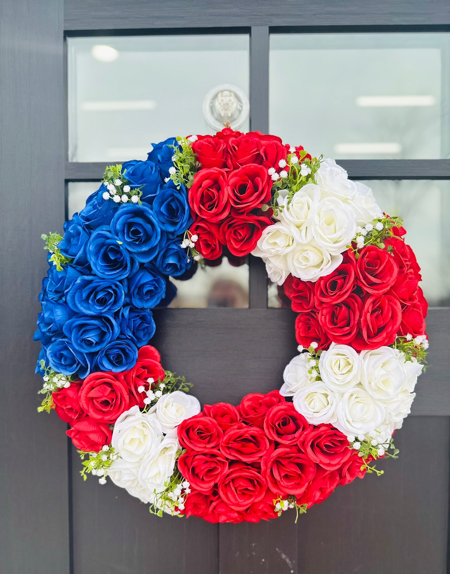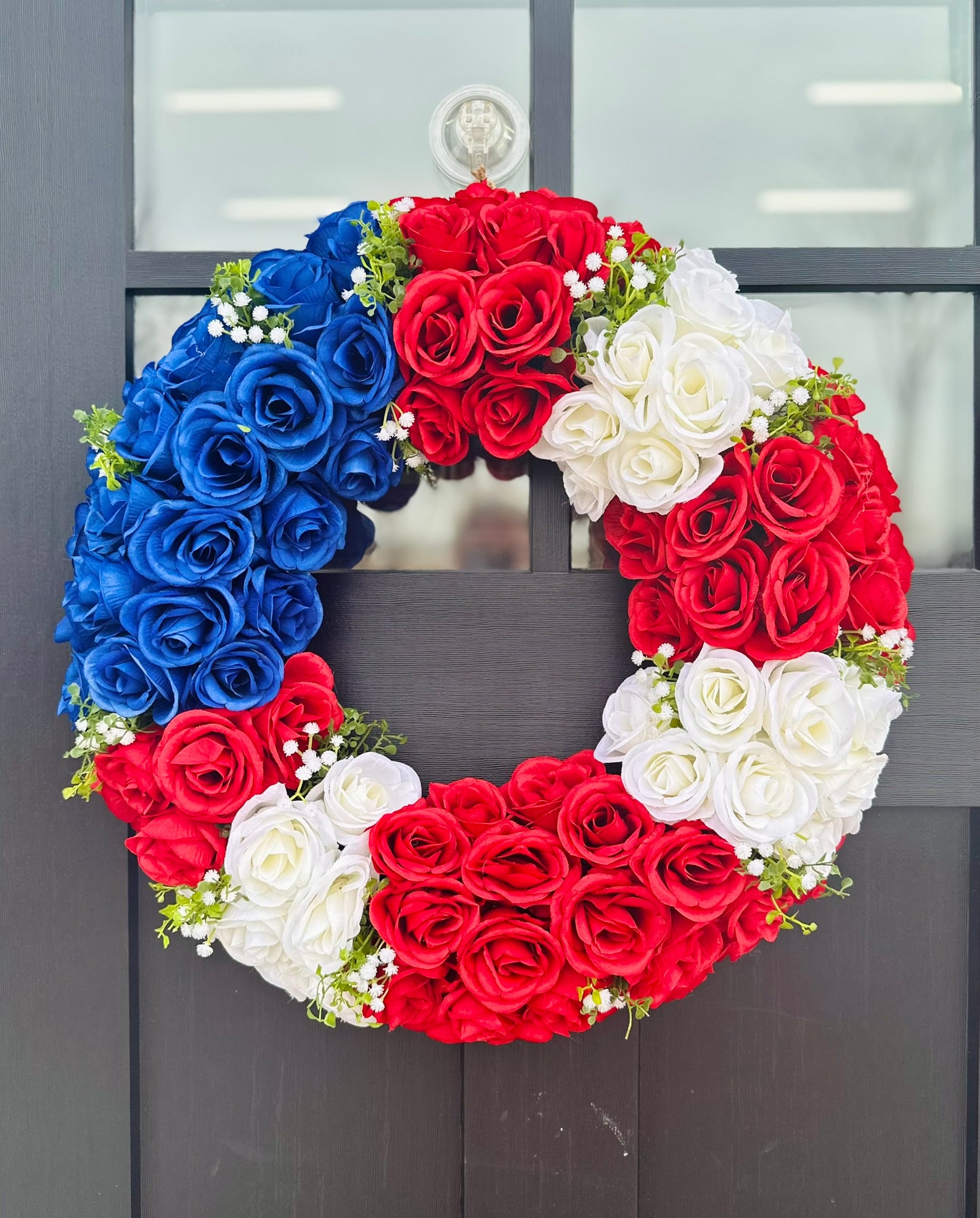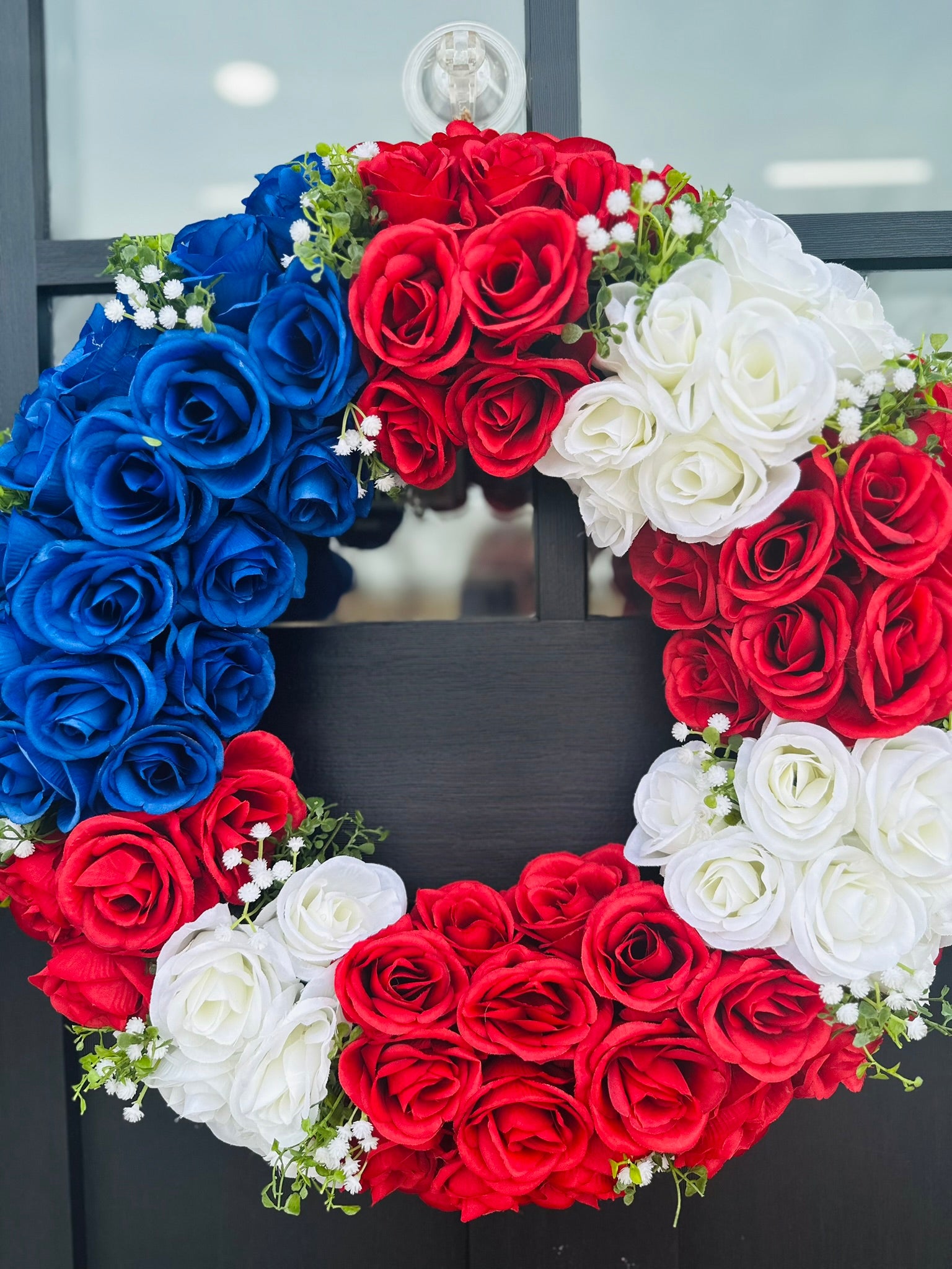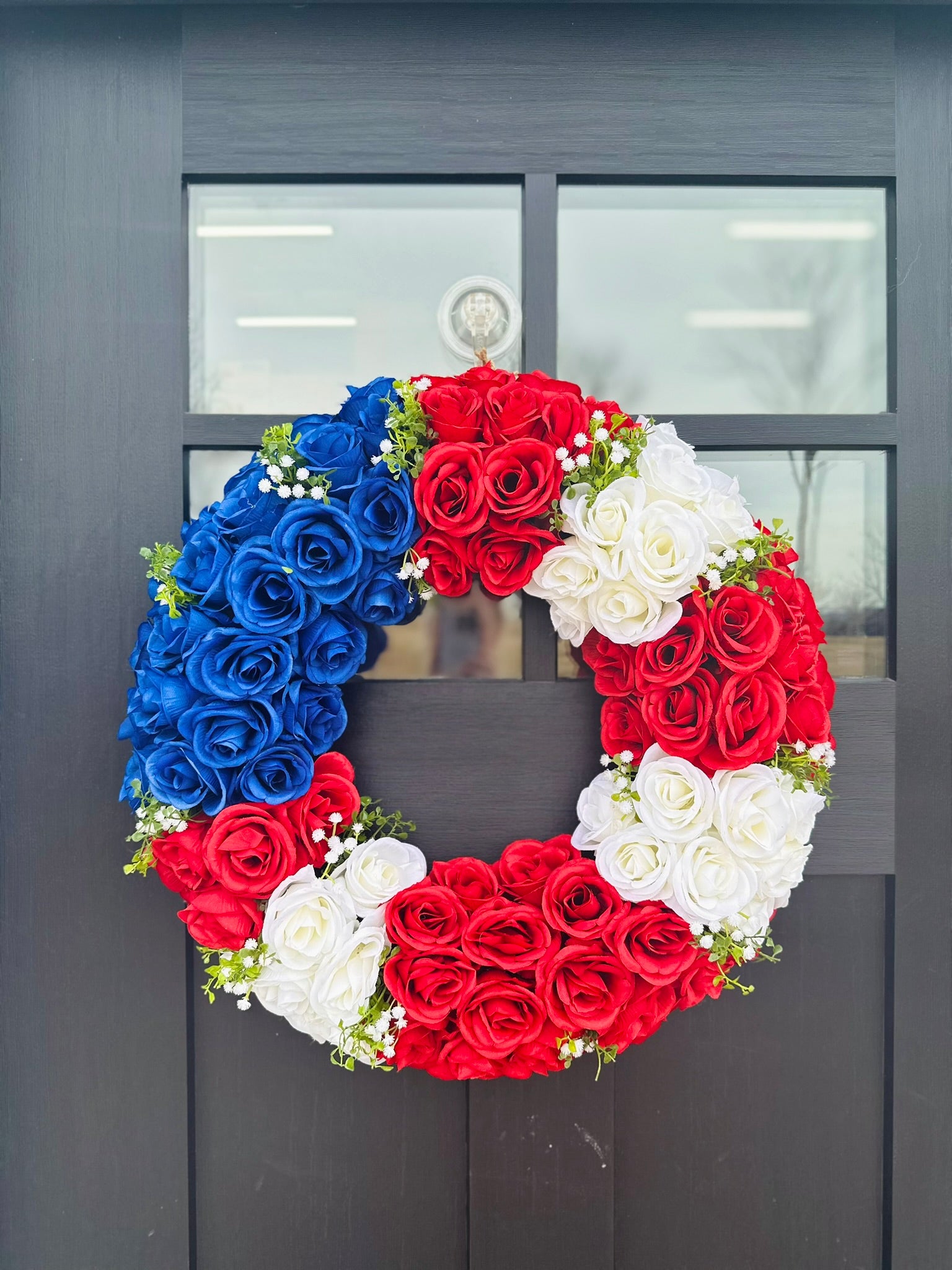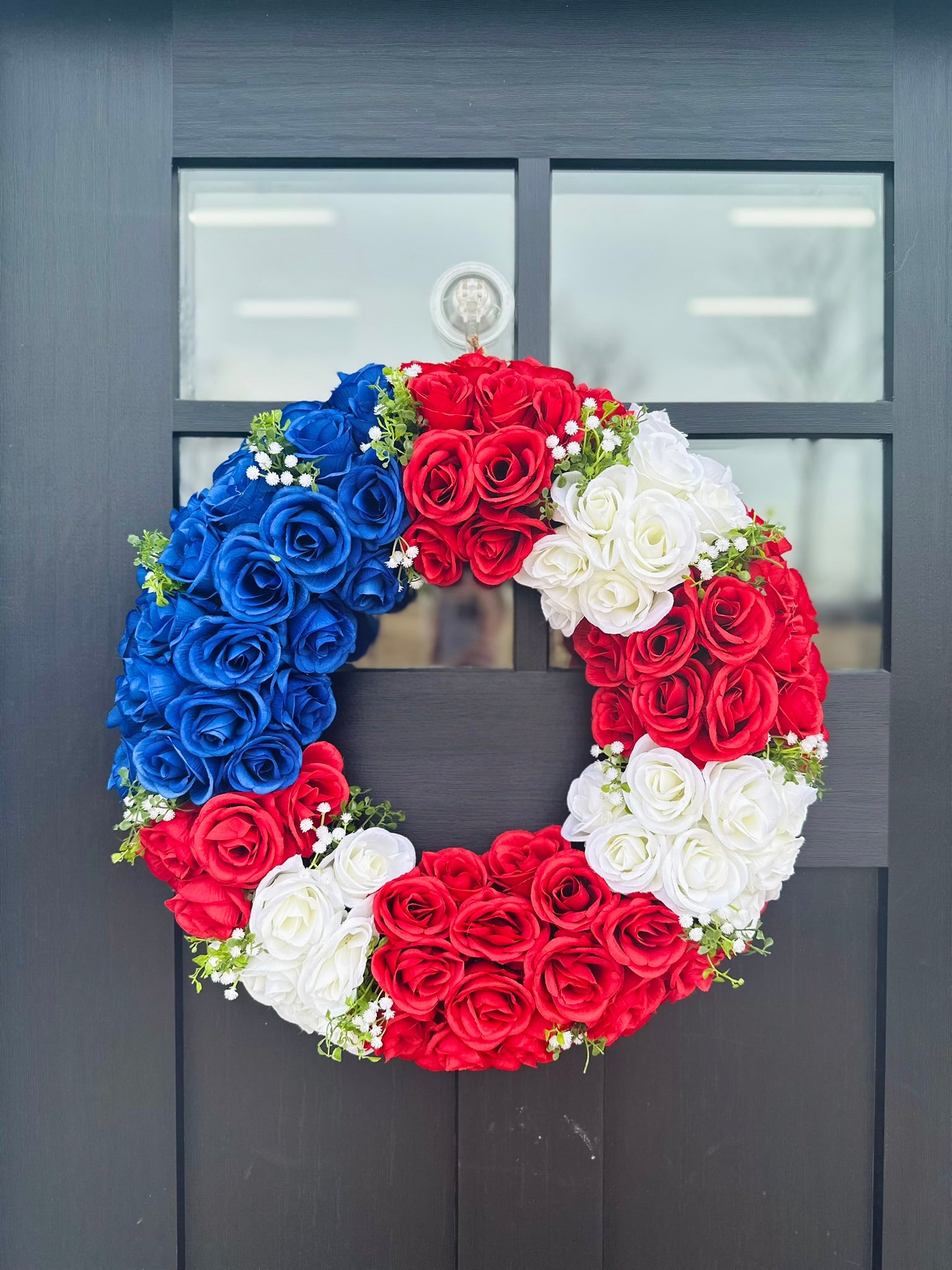 Celebrate freedom and American pride with this stunning red, white, and blue rose wreath, designed to bring a bold and elegant touch to your home!