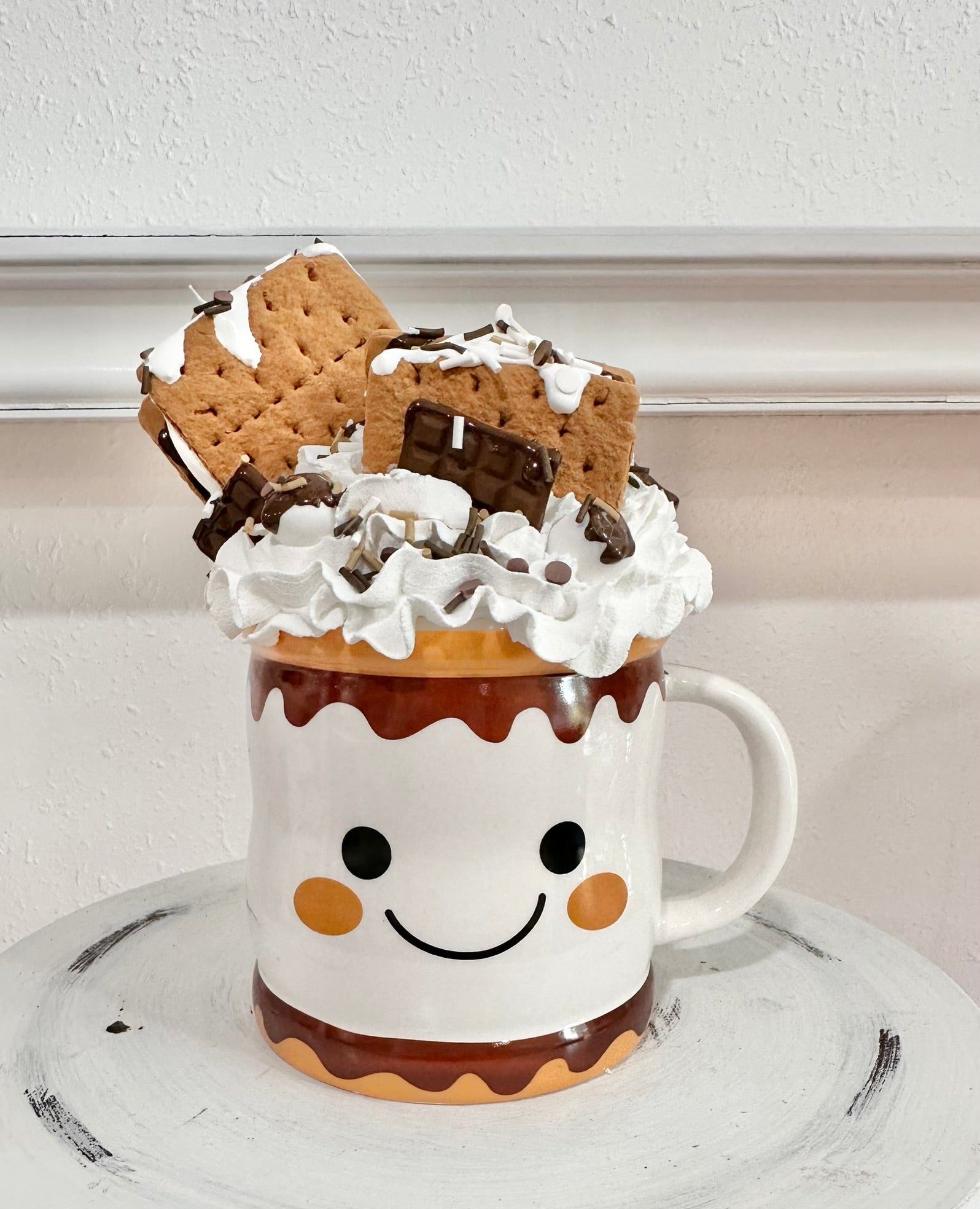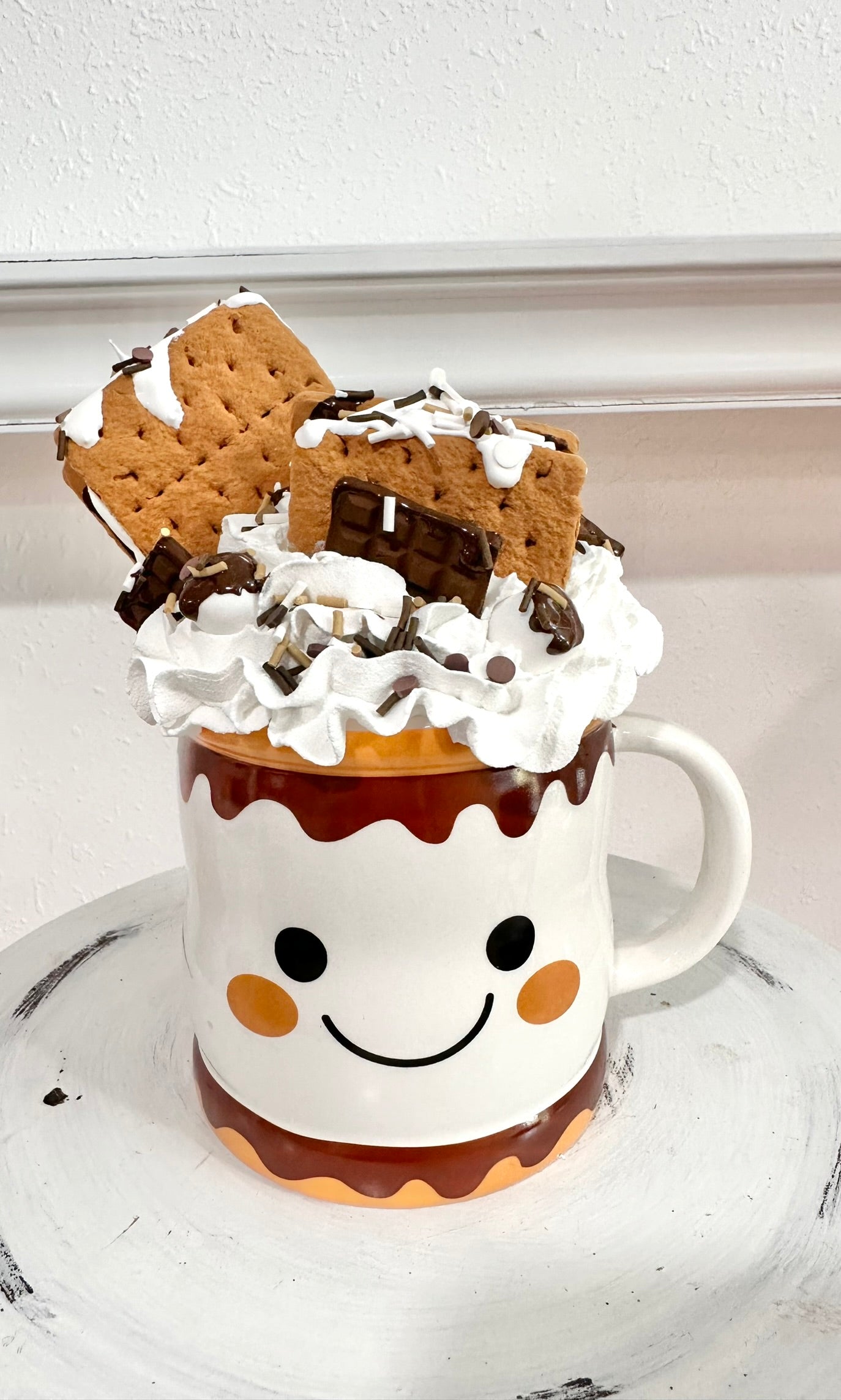 Design: Smiling face mug with faux graham crackers, chocolate, whipped cream, and sprinkles for a cute, cozy touch