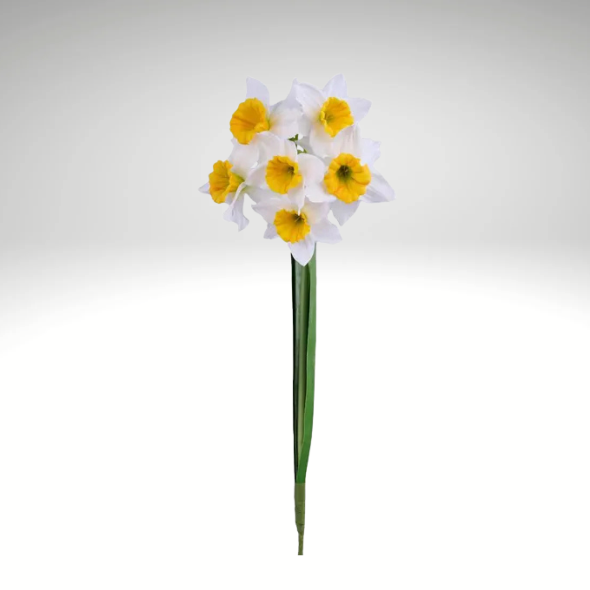 Bring a cheerful touch of spring to your designs with this Artificial Daffodil Spray in White and Yellow. Featuring bright yellow centers and crisp white petals, this faux daffodil spray captures the fresh, happy look of early spring without the short lifespan of real blooms.