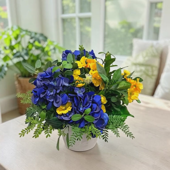 This vibrant floral arrangement combines rich blue real touch hydrangeas with cheerful yellow primroses for a fresh and colorful spring display. Designed with layered greenery and delicate accent florals, this arrangement brings bright garden-inspired charm to any space.