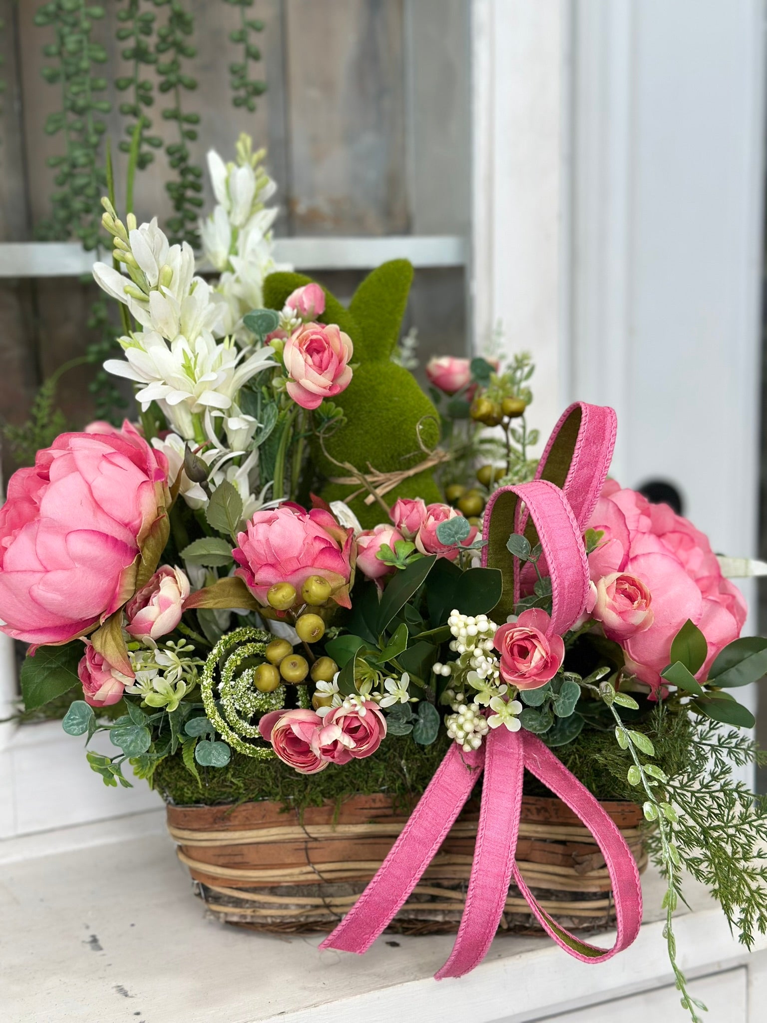 Easter Bunny Spring Centerpiece with Pink Peonies & Moss Bunny