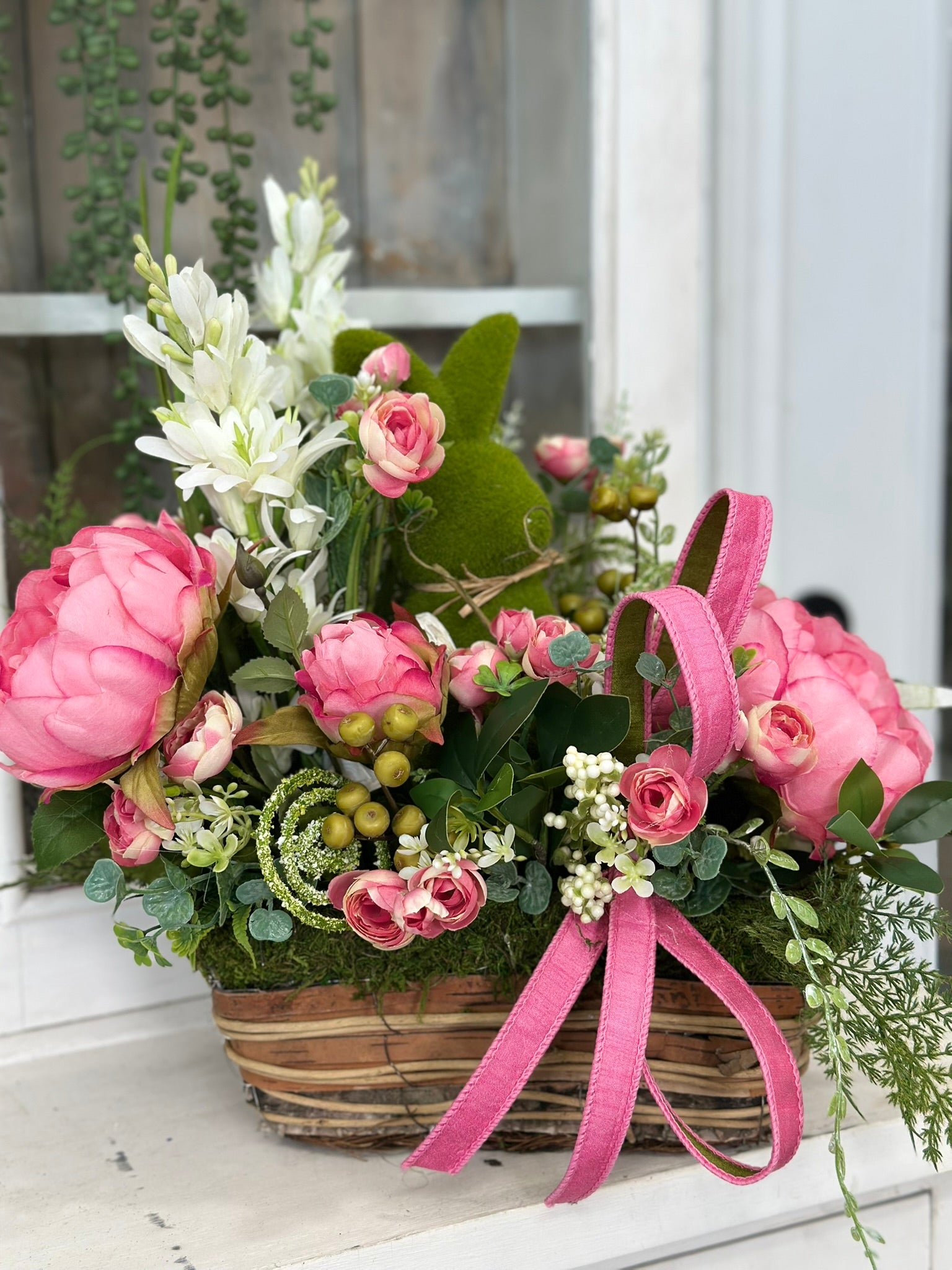 Welcome spring into your home with this Easter Bunny Spring Table Centerpiece Arrangement! Bursting with vibrant pink peonies, delicate mini ranunculus, and fresh white tuberose, this handcrafted piece is perfect for your Easter table or spring decor.