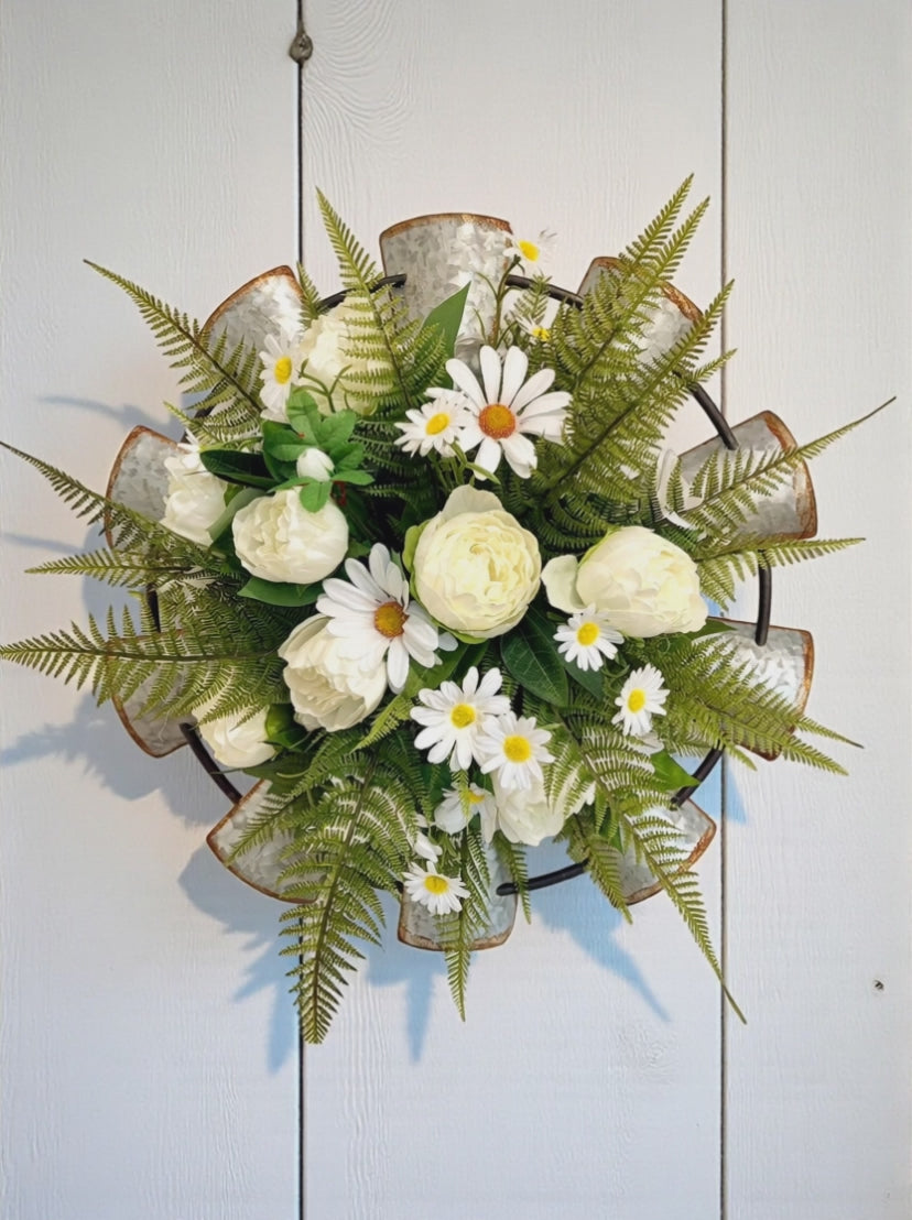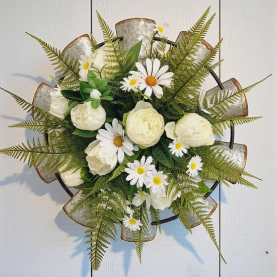 Add fresh farmhouse charm to your home with this galvanized windmill wall and door hanger. Designed with lush greenery and soft neutral florals, this piece blends rustic texture with garden-inspired elegance.