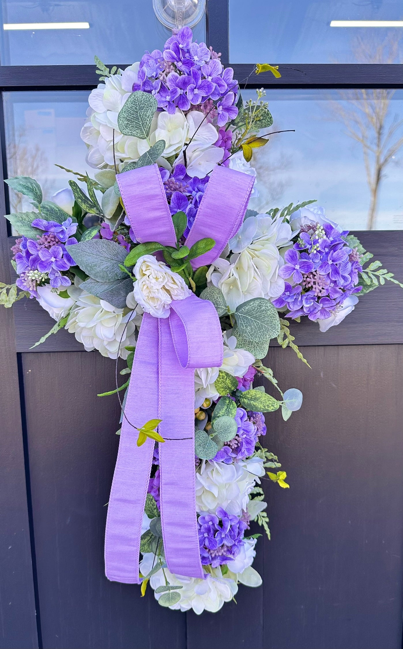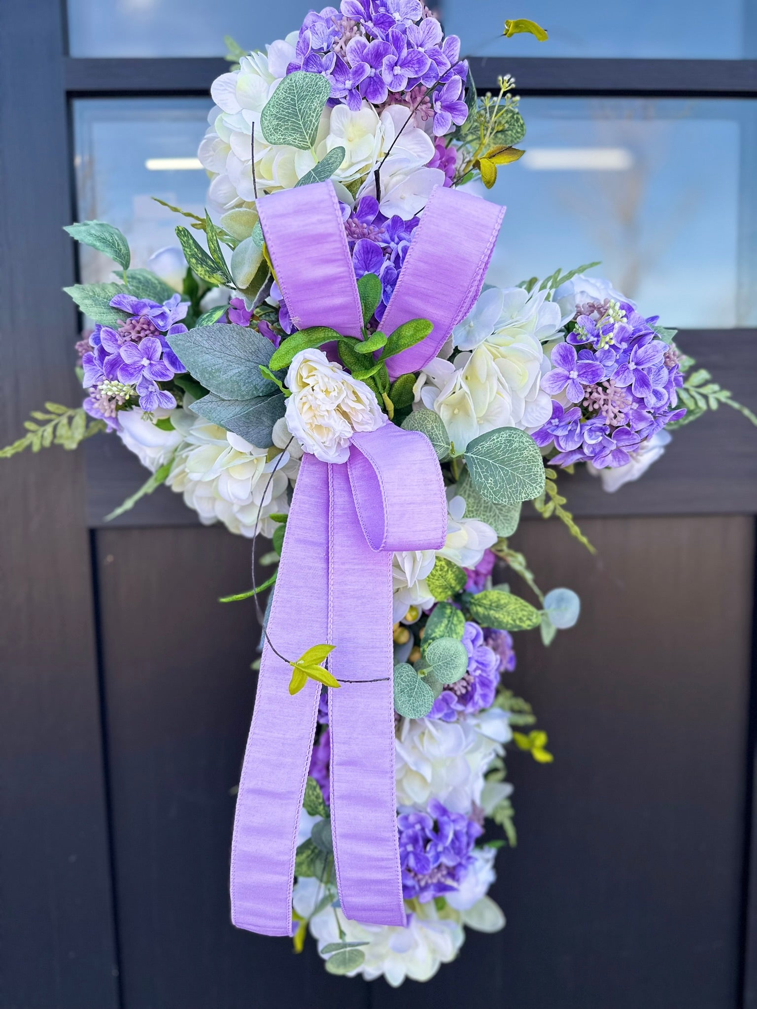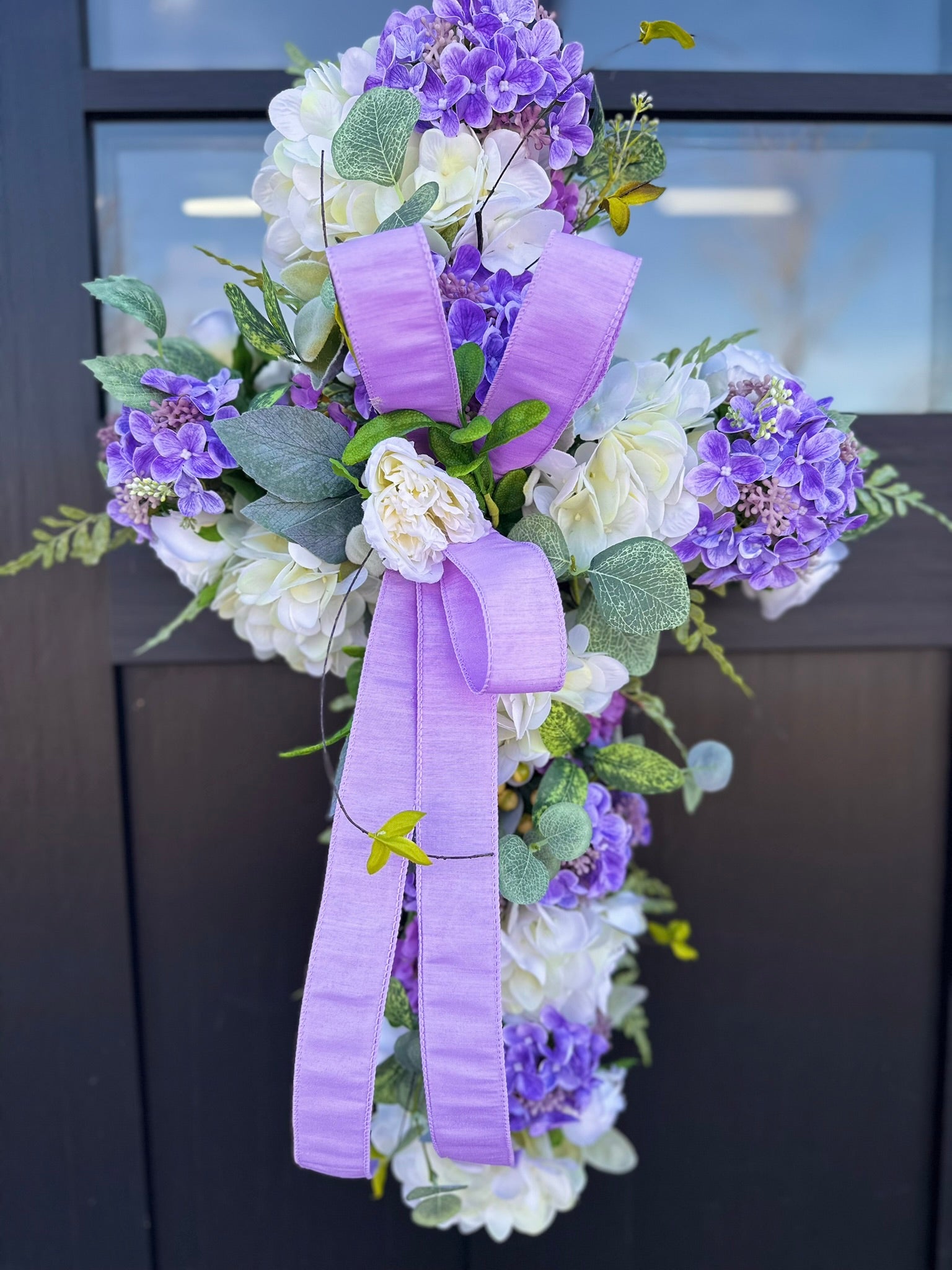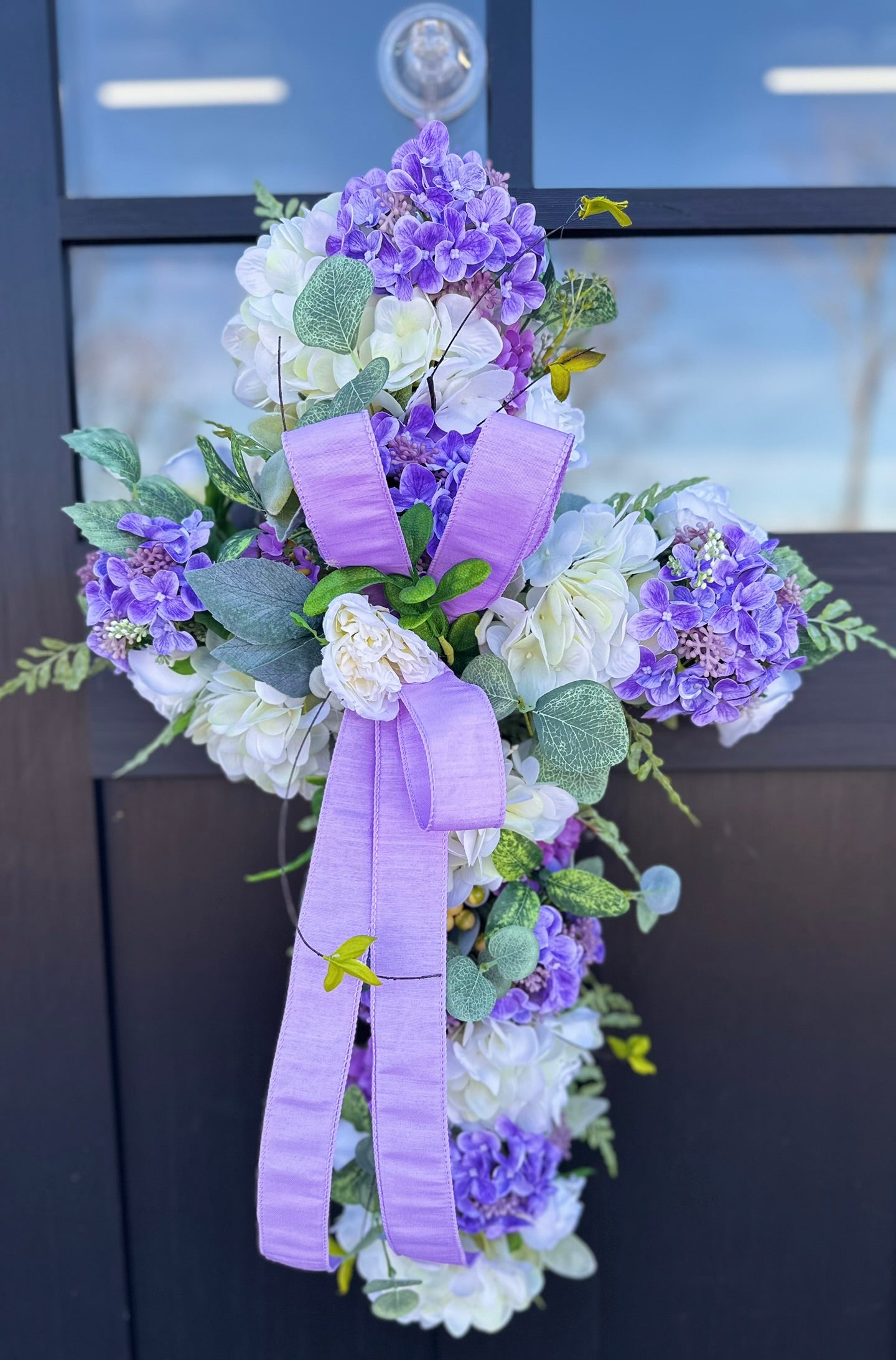Welcome spring with this charming handcrafted cross door hanger arrangement. Crafted on a moss grapevine cross, this vibrant and elegant piece is adorned with lush lifelike artificial flowers. Featuring vibrant real touch white hydrangeas, purple snowball sprays, purple hydrangea berry bushes, mini cabbage roses, and lush greenery, this door hanger is sure to bring a touch of springtime cheer to your home. A simple lavender bow adds a touch of elegance to this design.