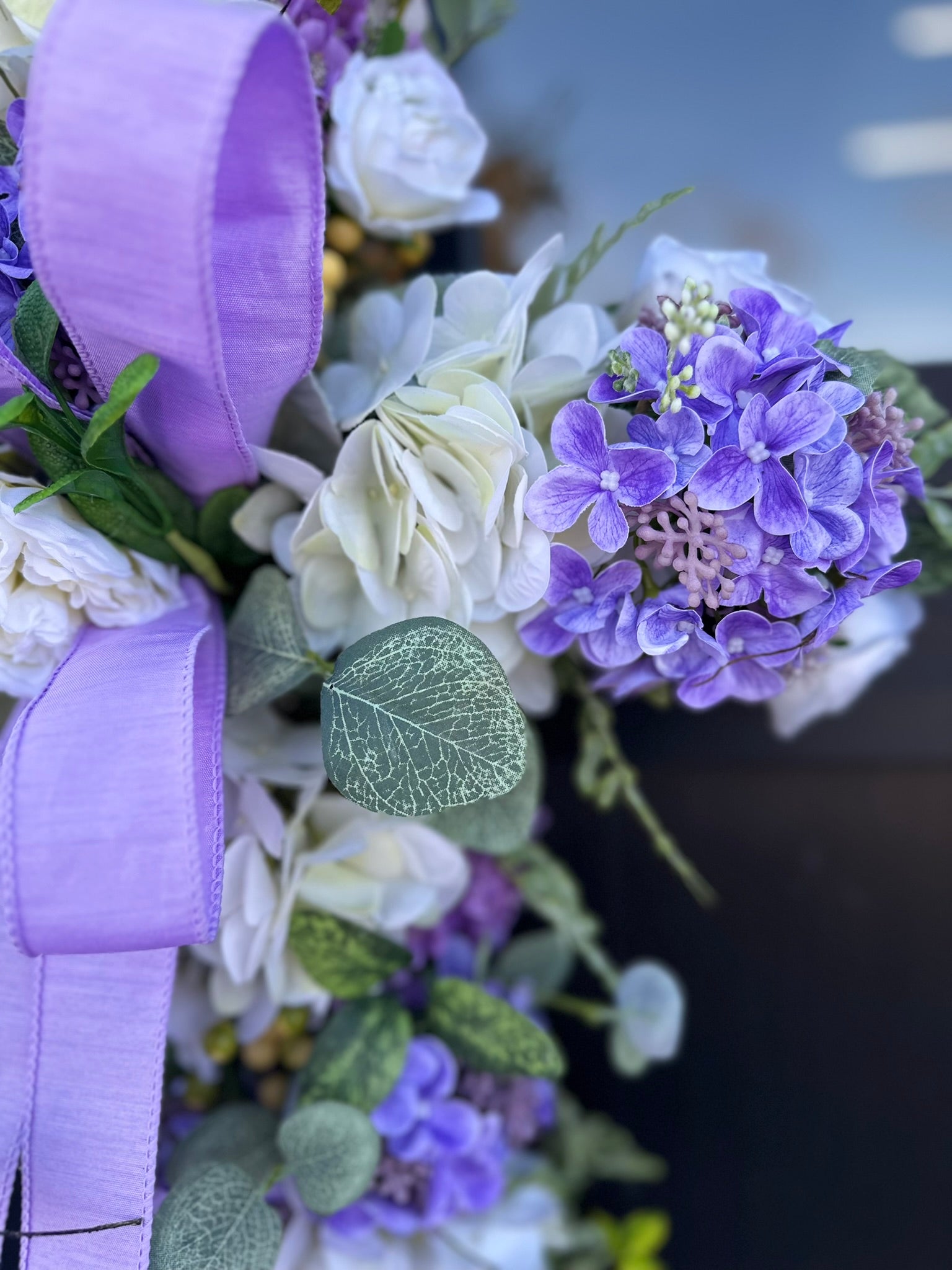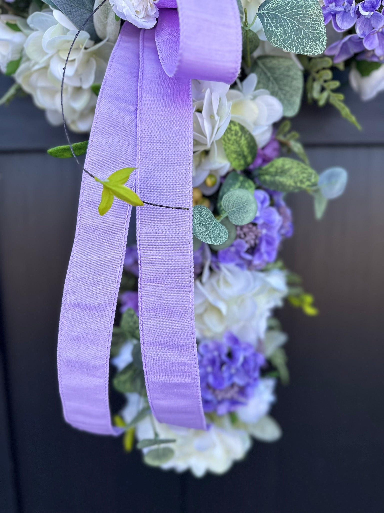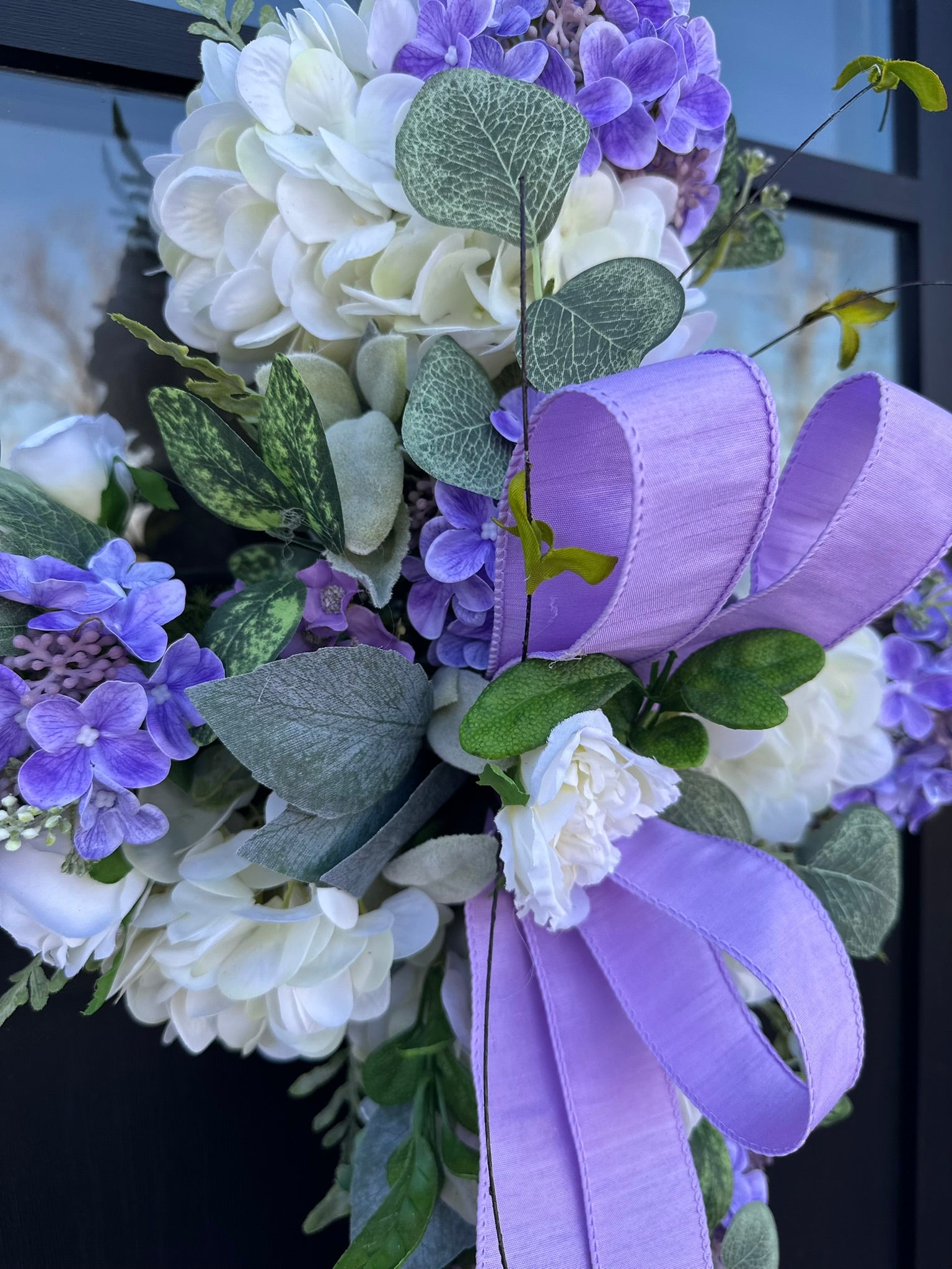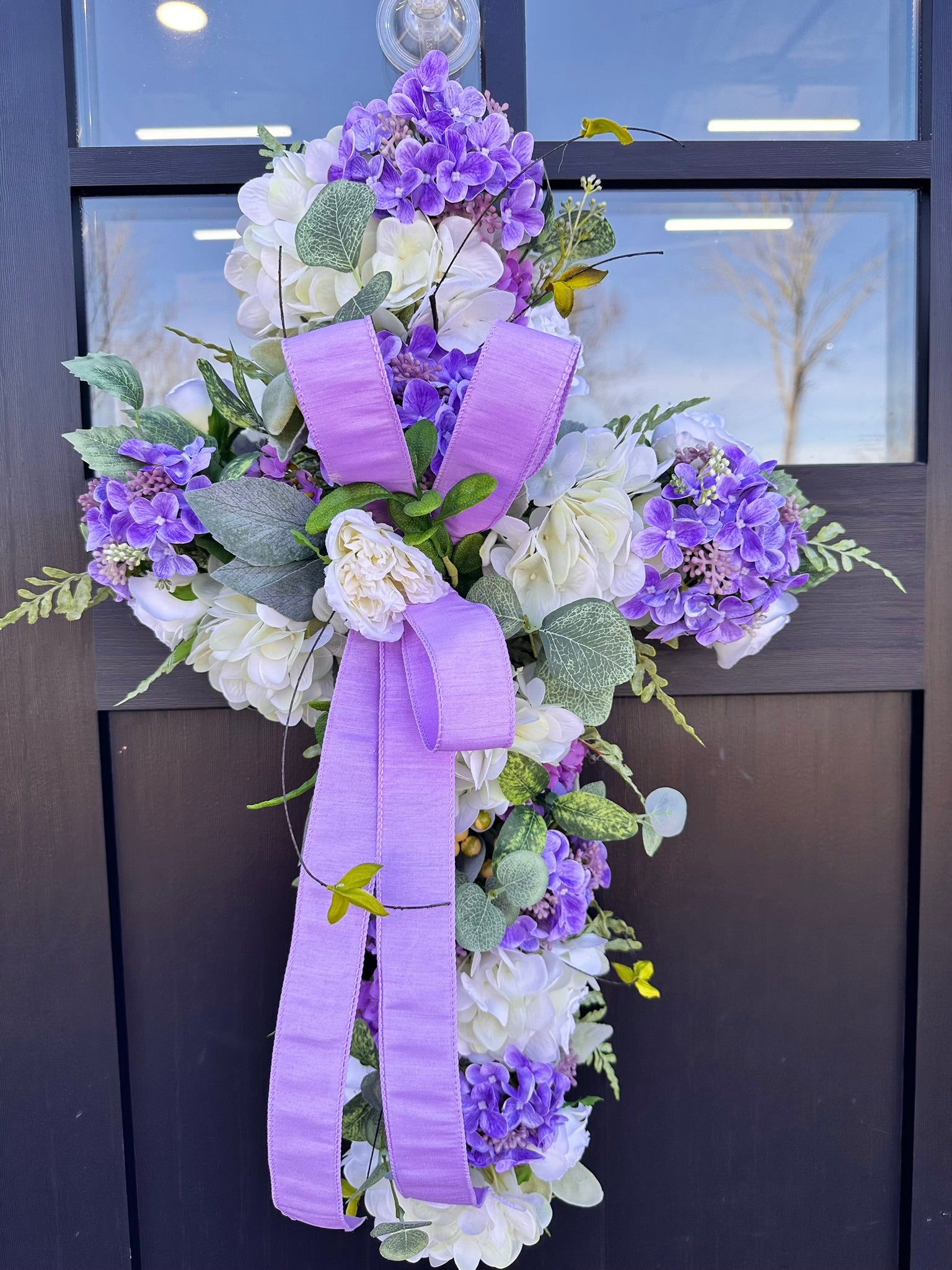 Welcome spring with this charming handcrafted cross door hanger arrangement. Crafted on a moss grapevine cross, this vibrant and elegant piece is adorned with lush lifelike artificial flowers. Featuring vibrant real touch white hydrangeas, purple snowball sprays, purple hydrangea berry bushes, mini cabbage roses, and lush greenery, this door hanger is sure to bring a touch of springtime cheer to your home. A simple lavender bow adds a touch of elegance to this design.