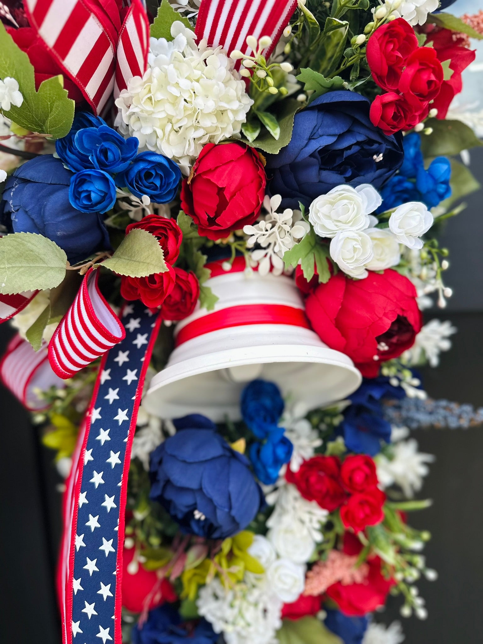 The focal point? A charming metal Liberty Bell nestled among lush florals and layered with stars-and-stripes ribbon for the ultimate 4th of July, Memorial Day, or Veterans Day accent.