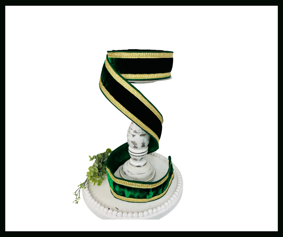 Infuse your creative projects with a touch of opulence using our 2.5-inch Emerald Green Velvet Farrisilk Wired Ribbon, elegantly trimmed with gold pleated borders. This luxury ribbon exudes sophistication, offering the perfect balance of soft velvet texture and lustrous platinum detailing to elevate any craft or decoration