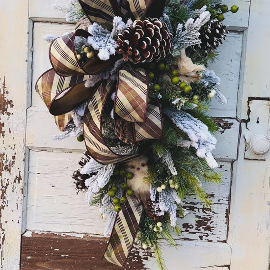 Rustic Owl Winter Swag | Woodland Christmas Door Decor | Pinecone Flocked Greenery