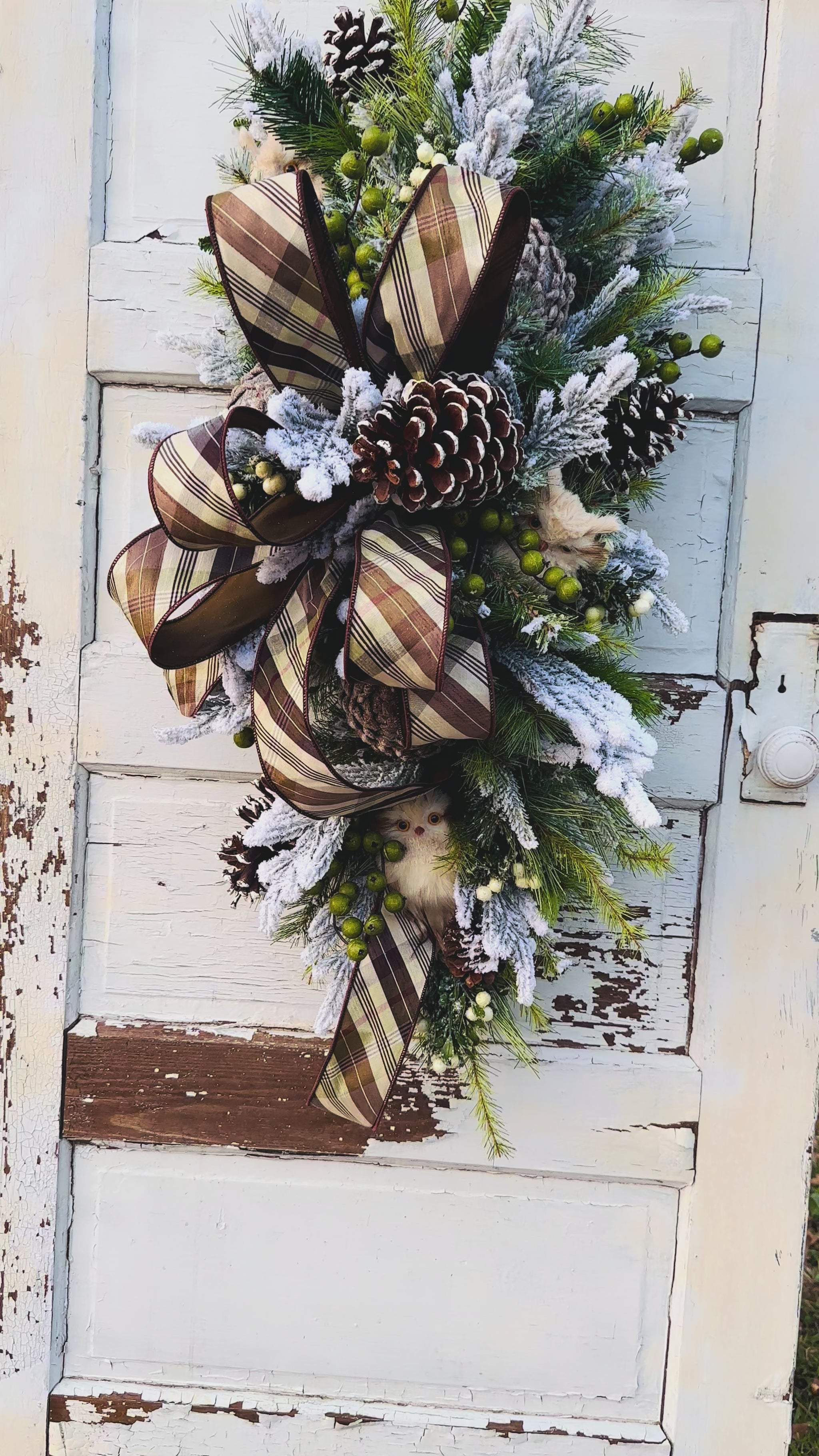 This lush design features three adorable snow owls, large chunky pinecone picks, mixed snowy greenery, flocked Norfolk pine, and textured winter elements like green crabapple picks and pinecone ball ornaments. A rich designer plaid ribbon completes the look, giving the swag that classic rustic-holiday feel.