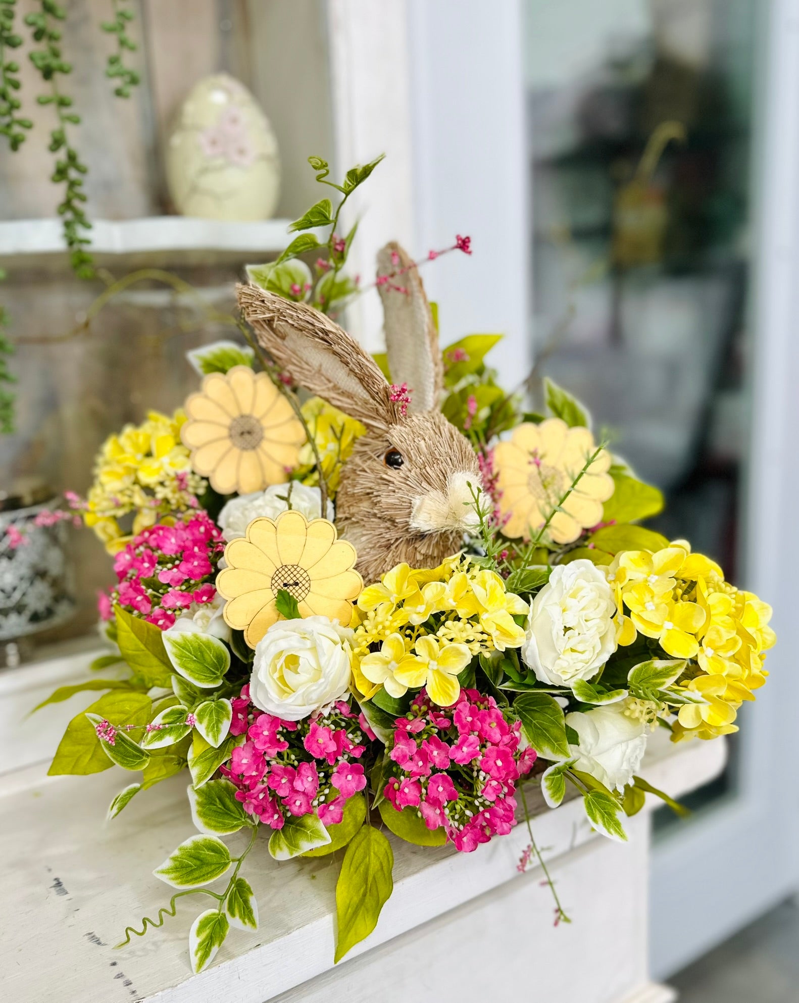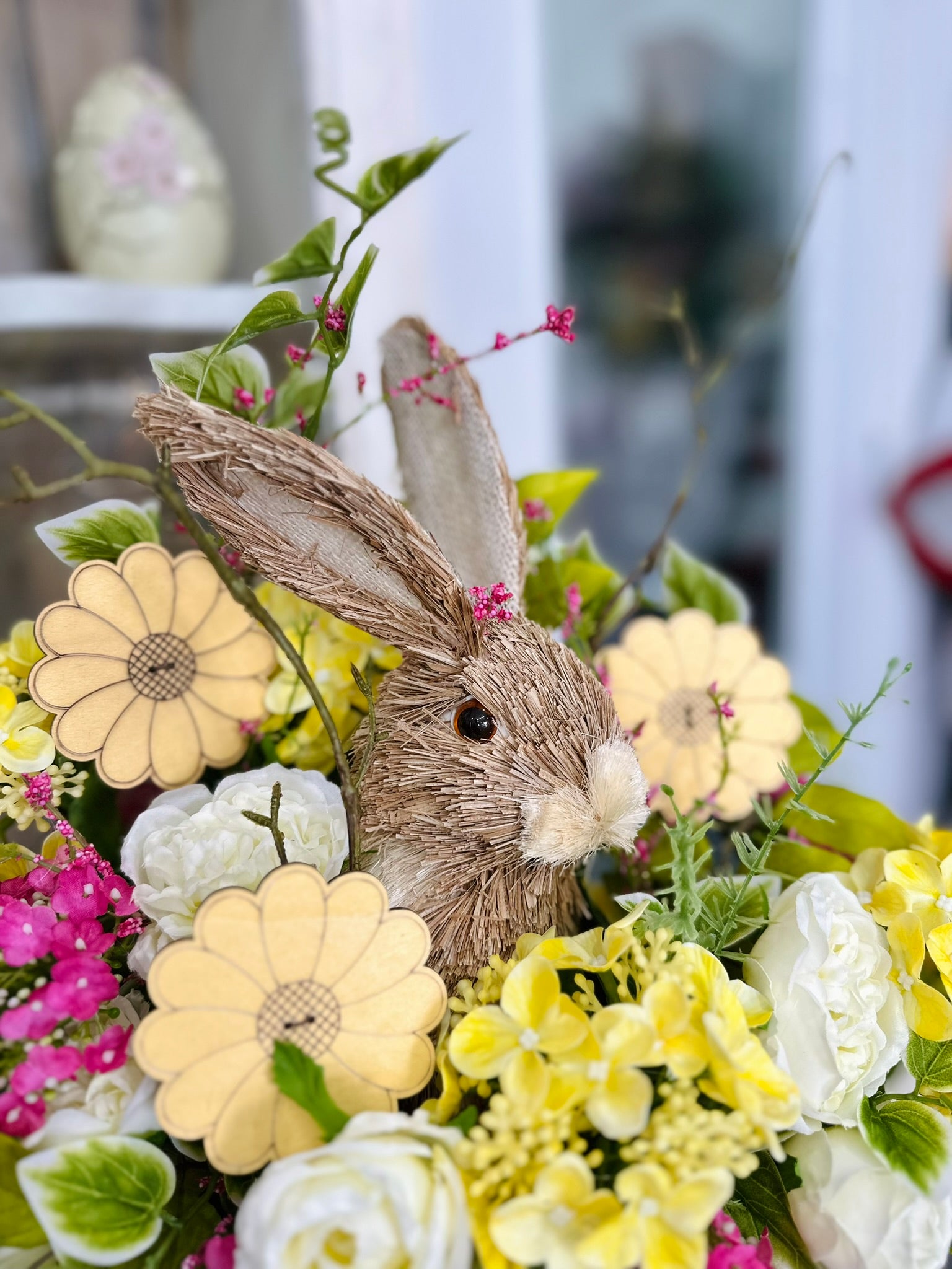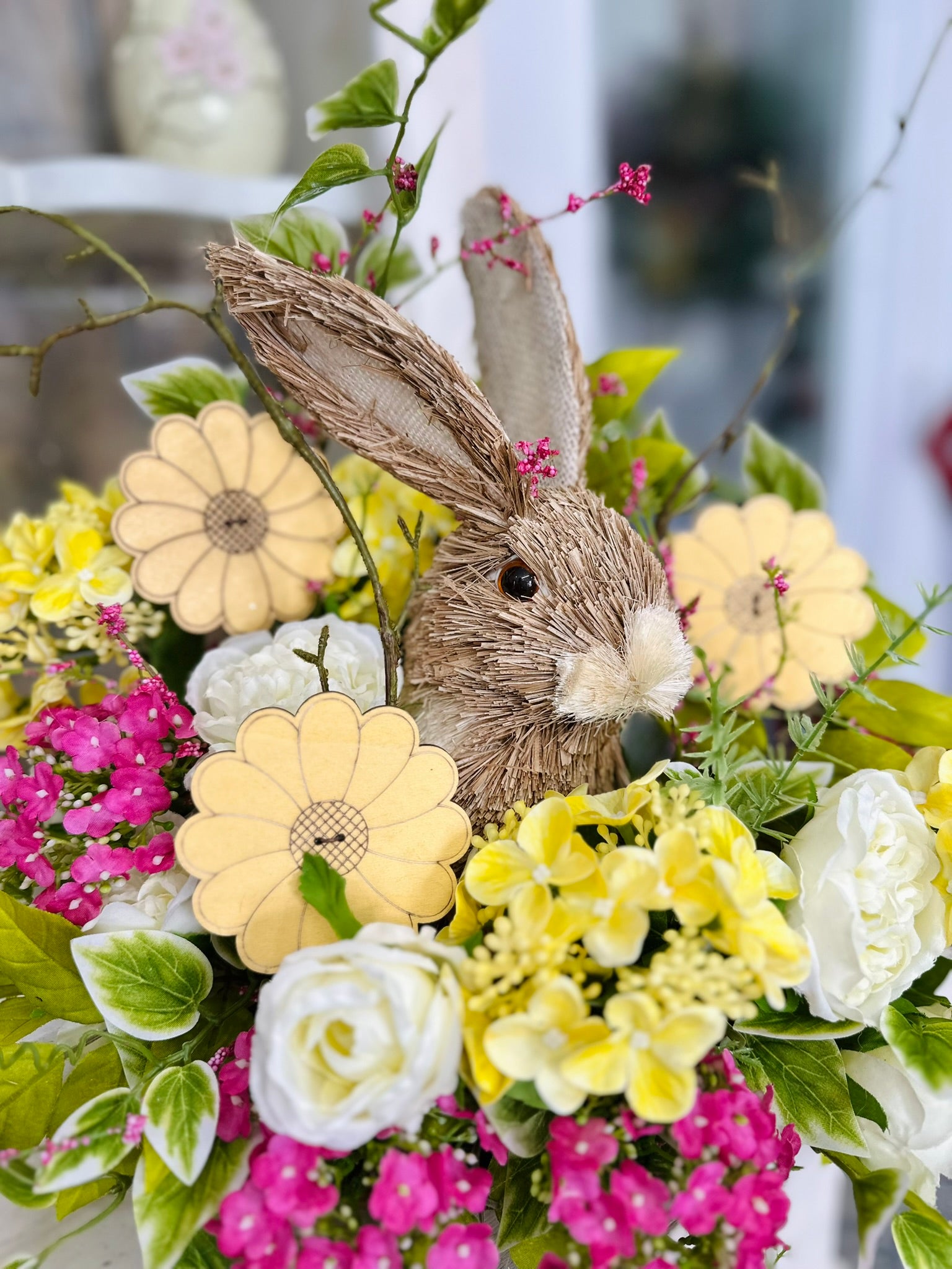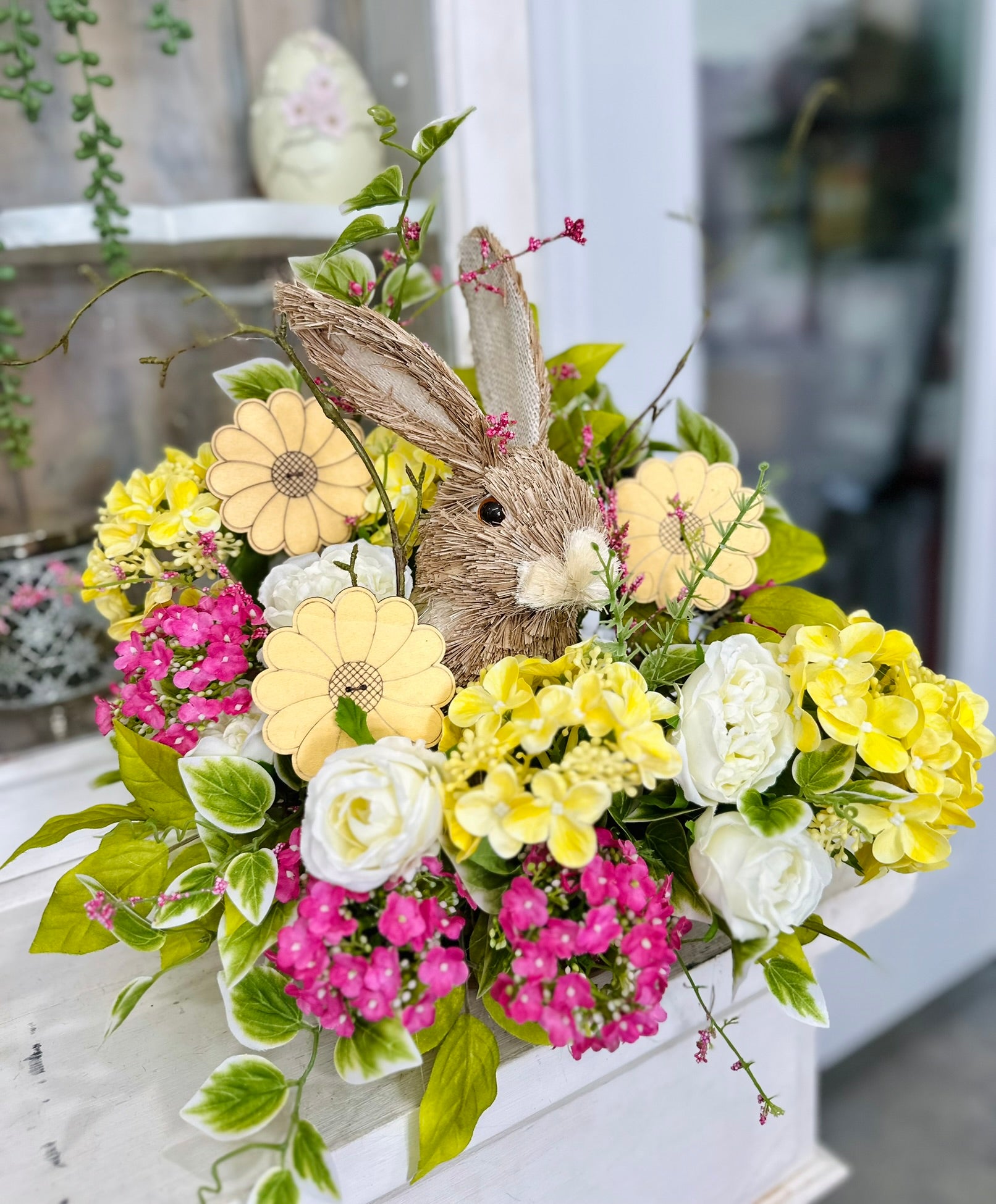 Materials: Artificial flowers, faux twigs, wooden daisy sprays, Sisal bunny, artificial greenery