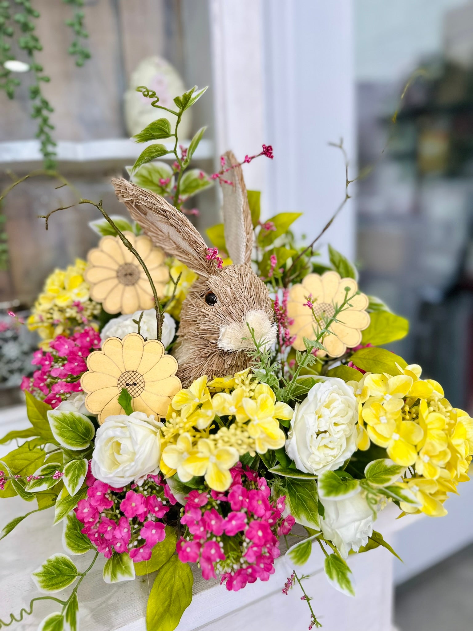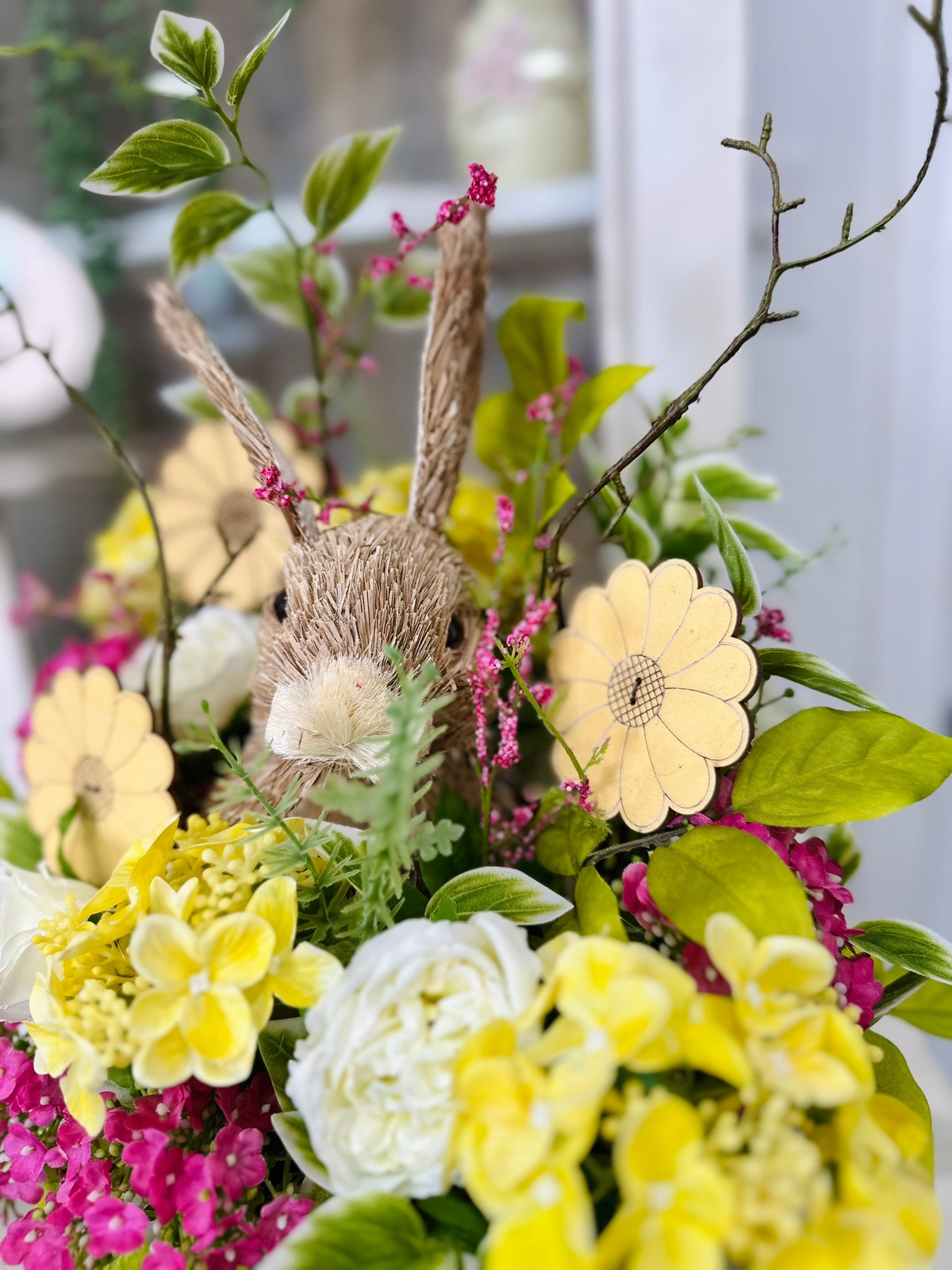 Sisal Bunny Easter Floral Arrangement | Spring Centerpiece with Yellow & Pink Flowers