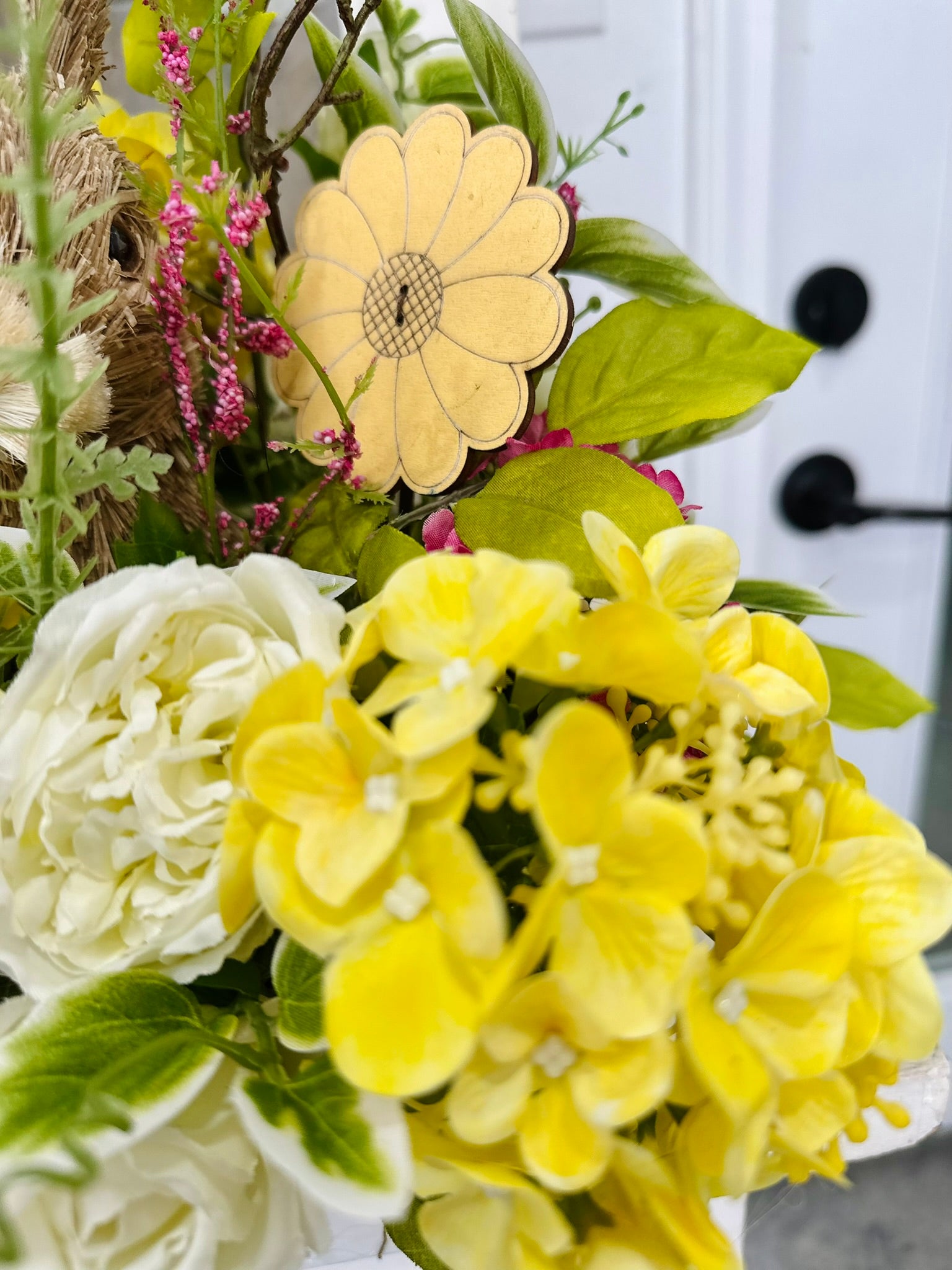 Vibrant Spring Colors: Features yellow, pink, and white blooms for a fresh seasonal look.