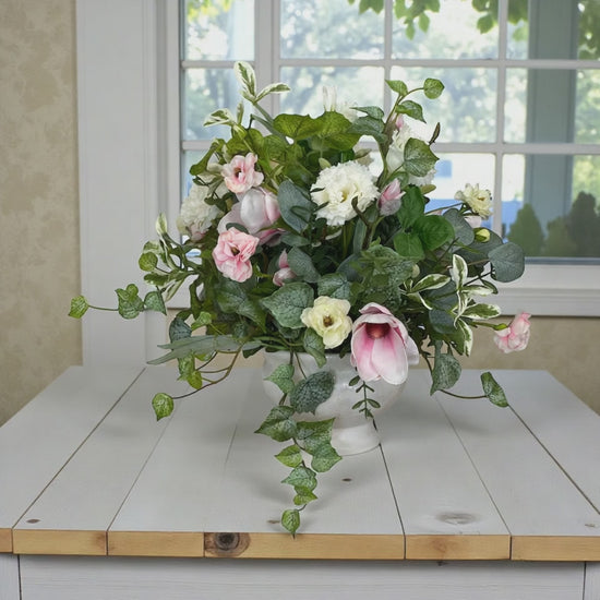 Arranged in a beautiful ceramic footed container, it’s the perfect centerpiece for an entryway table, dining table, console, or bedroom dresser. The cascading cottonwood ivy and marlberry sprays give it that natural, garden-gathered feel our customers love.