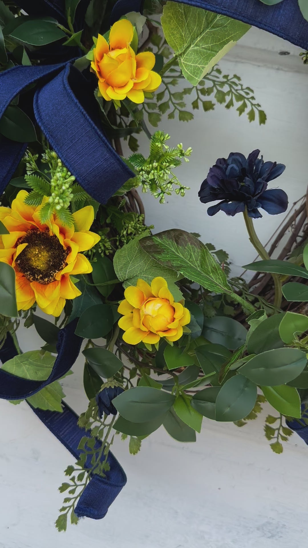 Crafted onto a sturdy grapevine base, the wreath is adorned with lush greenery and bold navy ribbons that beautifully complement the cheerful yellow of the sunflowers. This color combination is not only striking but also versatile, blending seamlessly with both bright summer themes and the richer tones of autumn.