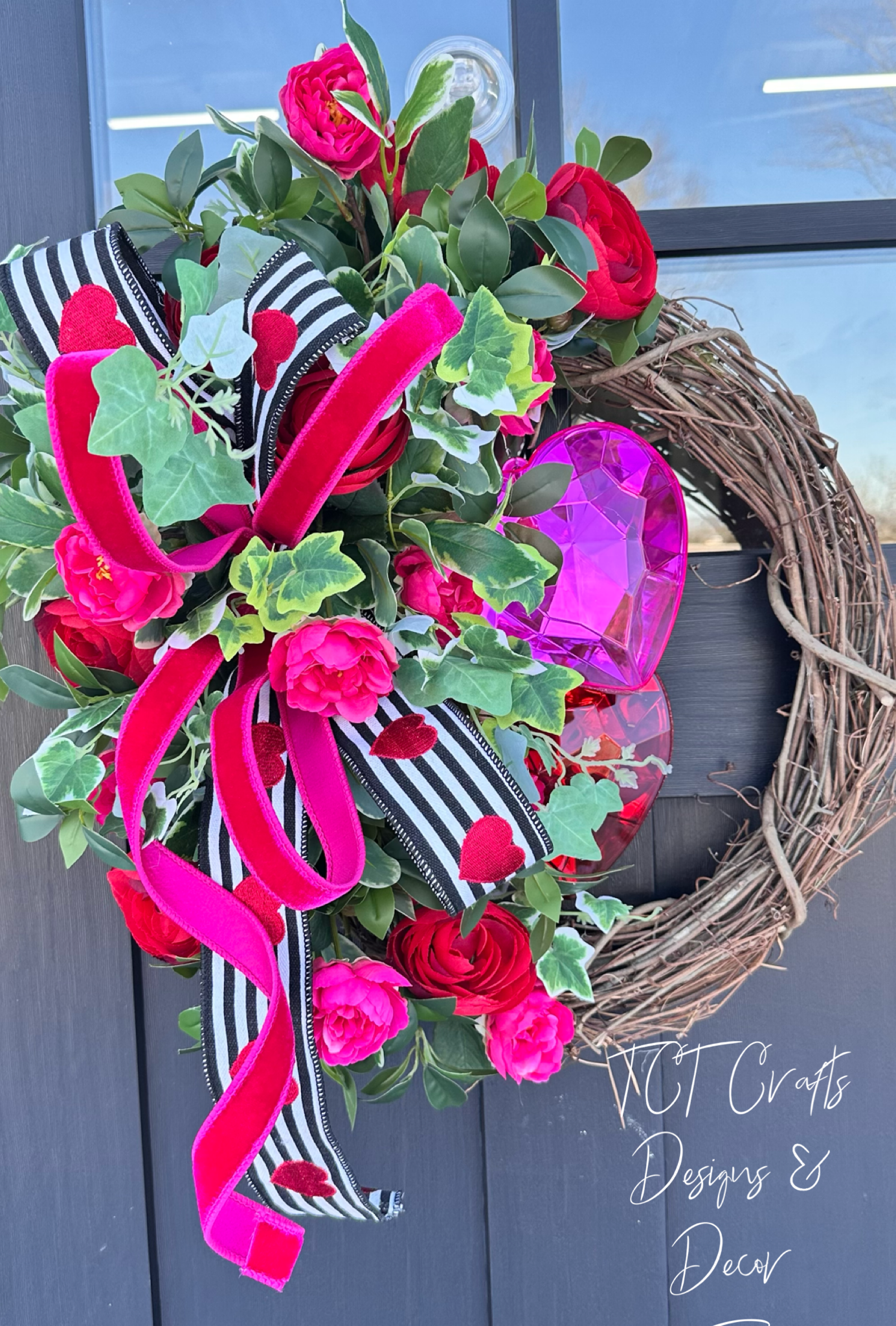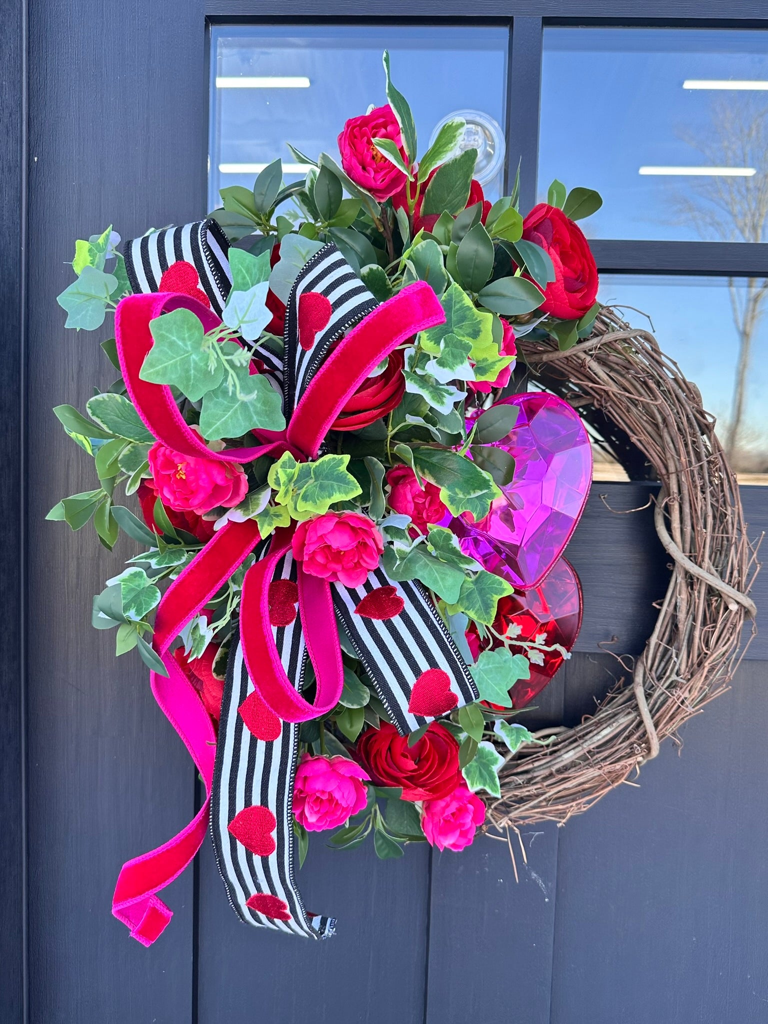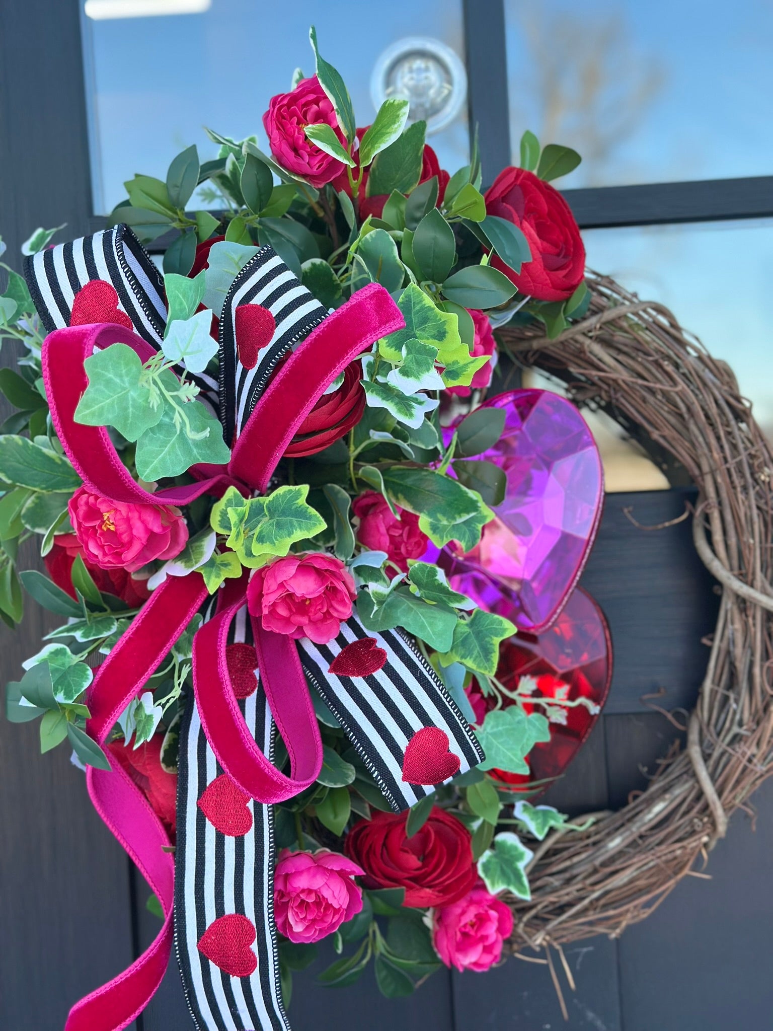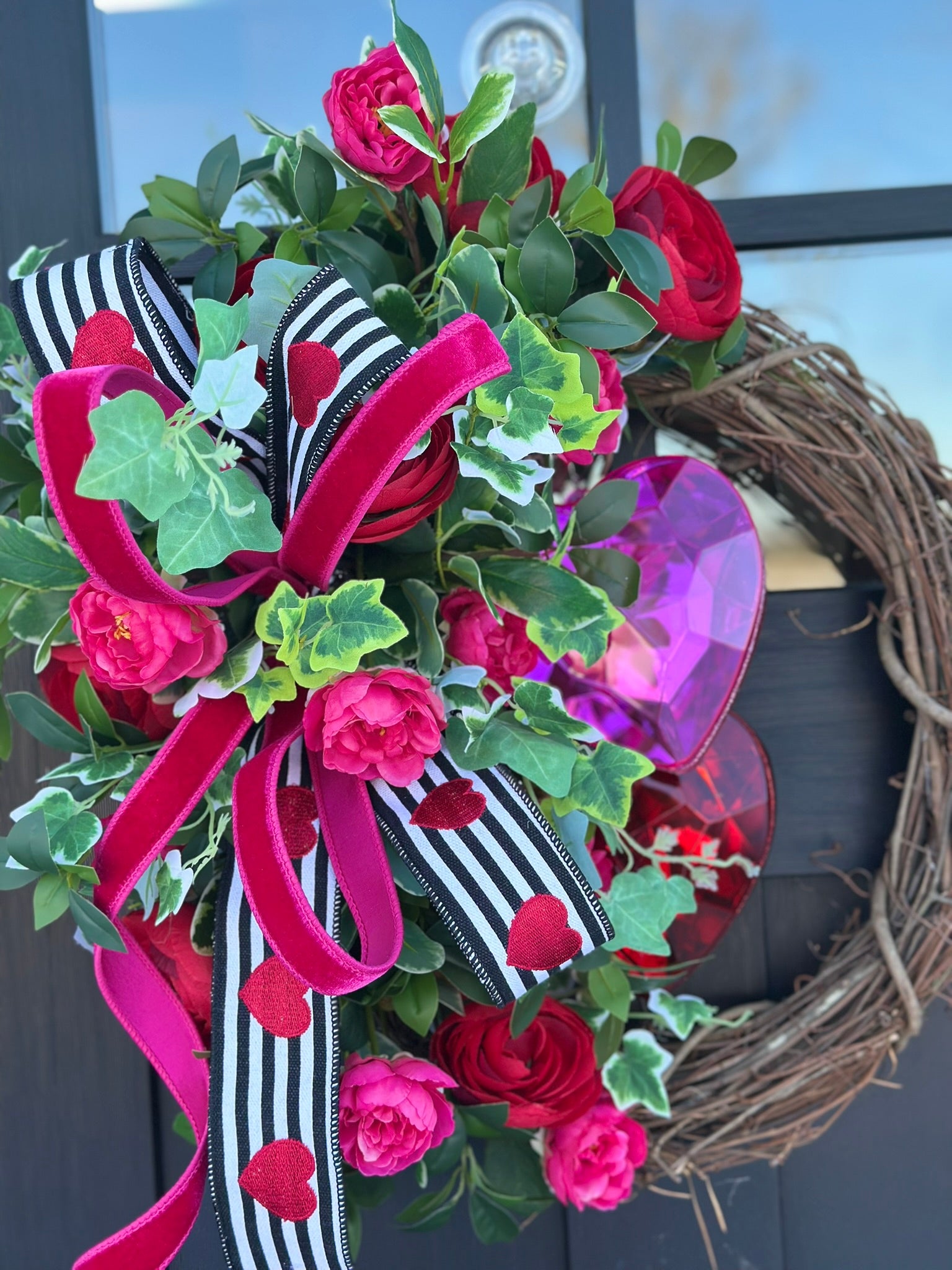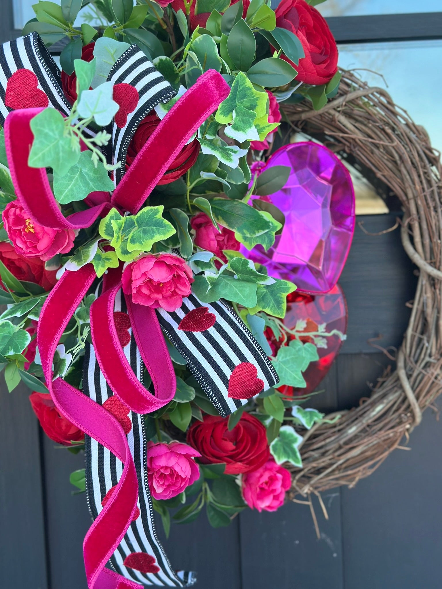 Celebrate love in style with this Valentine's Day Floral Grapevine Wreath, featuring vibrant red ranunculus, pink camellia roses, and lush greenery. Accented with sparkling Farrisilk Jewel Heart Ornaments in red and pink, this wreath is a stunning addition to your Valentine's Day decor. The elegant D. Stevens Valentine's ribbon and hot pink Farrisilk ribbon bow tie everything together beautifully.