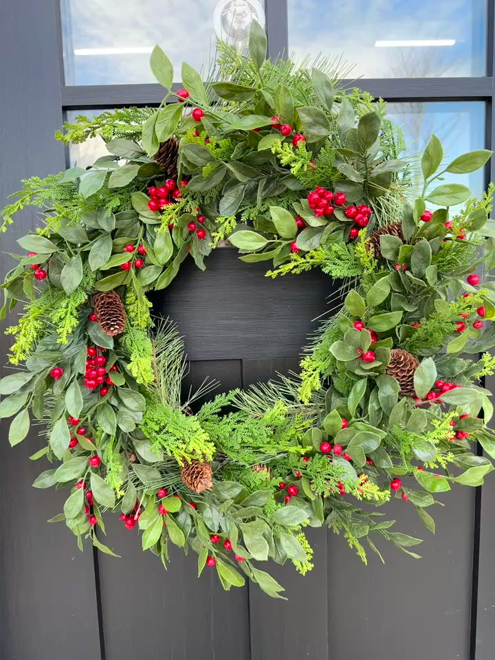 Winter Berry & Pine Cone Grapevine Wreath - 24"x24" Front Door Decor