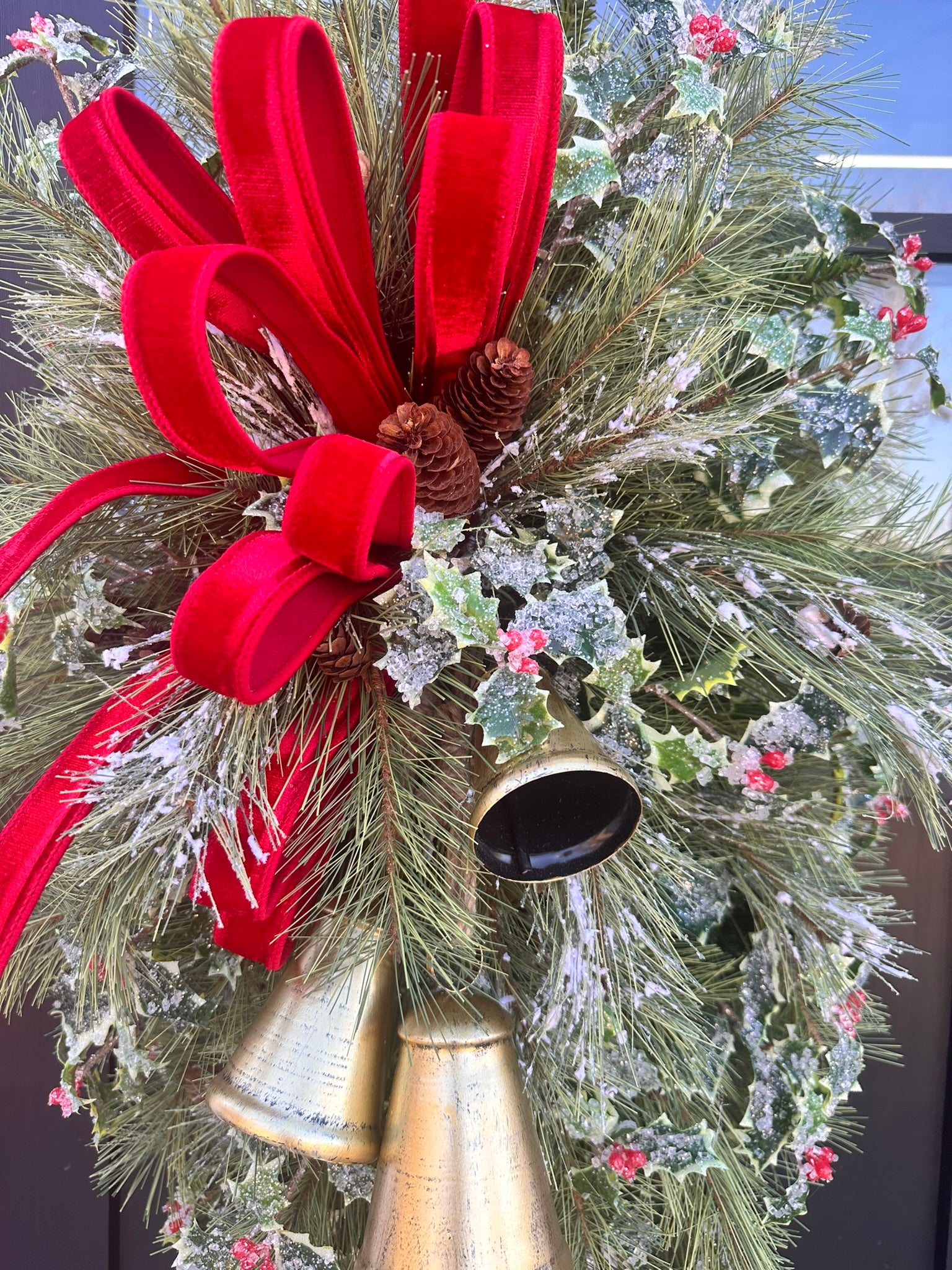 XL Designer Holly & Pine Bell Swag- Rustic Elegant Winter Front Door Decor, 40x25, Christmas Swag with Red Velvet Bow and Bells